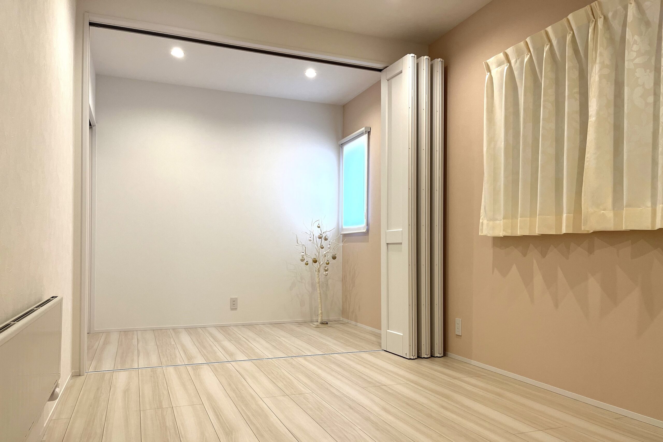 寝室の一部を家事や仕事をするスペースとして活用するため、可動間仕切りを設置しました。 一部屋として使用する際には、空間を出来るだけ広く使えるようにするため、省スペースに収納できる折戸を採用しています。