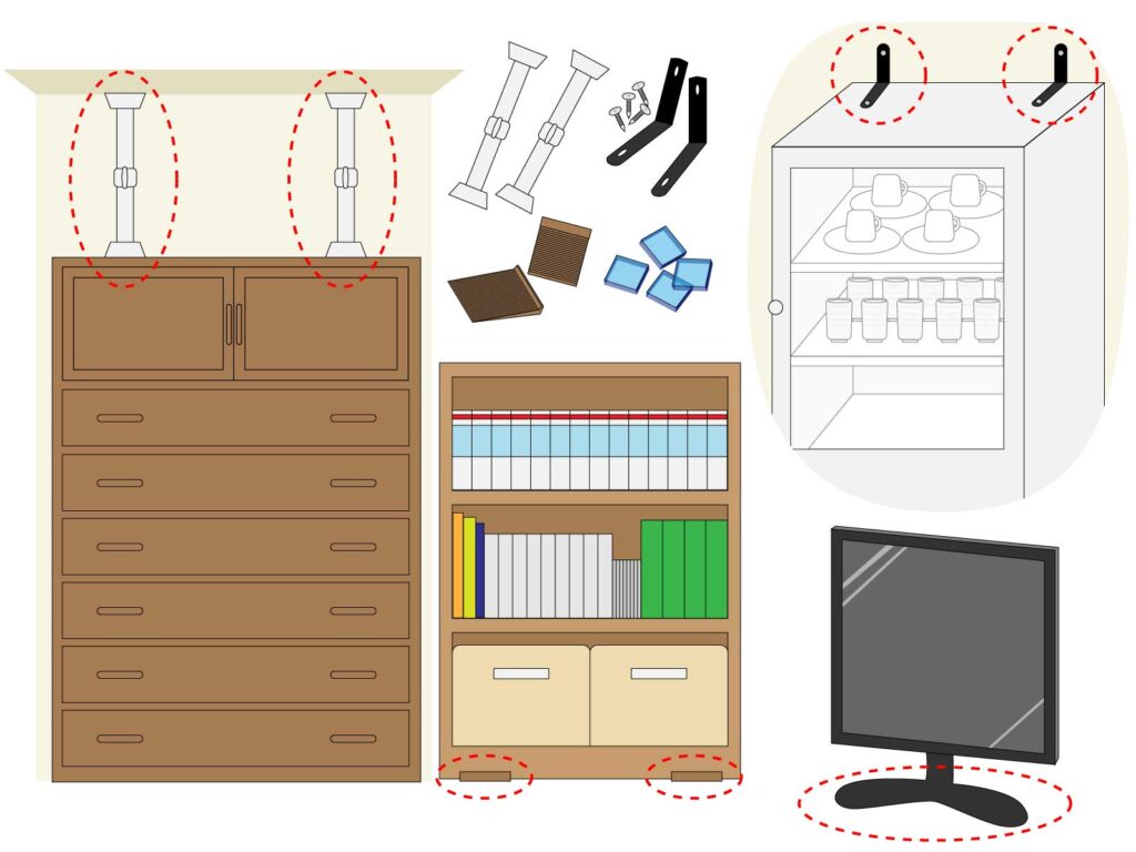 寝室や子ども部屋などには、できるだけ家具を置かないようにし、家具を置く場合はなるべく背の低い家具にし、転倒防止対策をとりましょう。