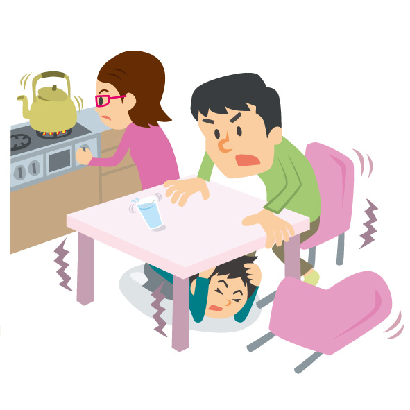 座布団などで頭を保護し、大きな家具から離れ、丈夫な机の下などに隠れる。